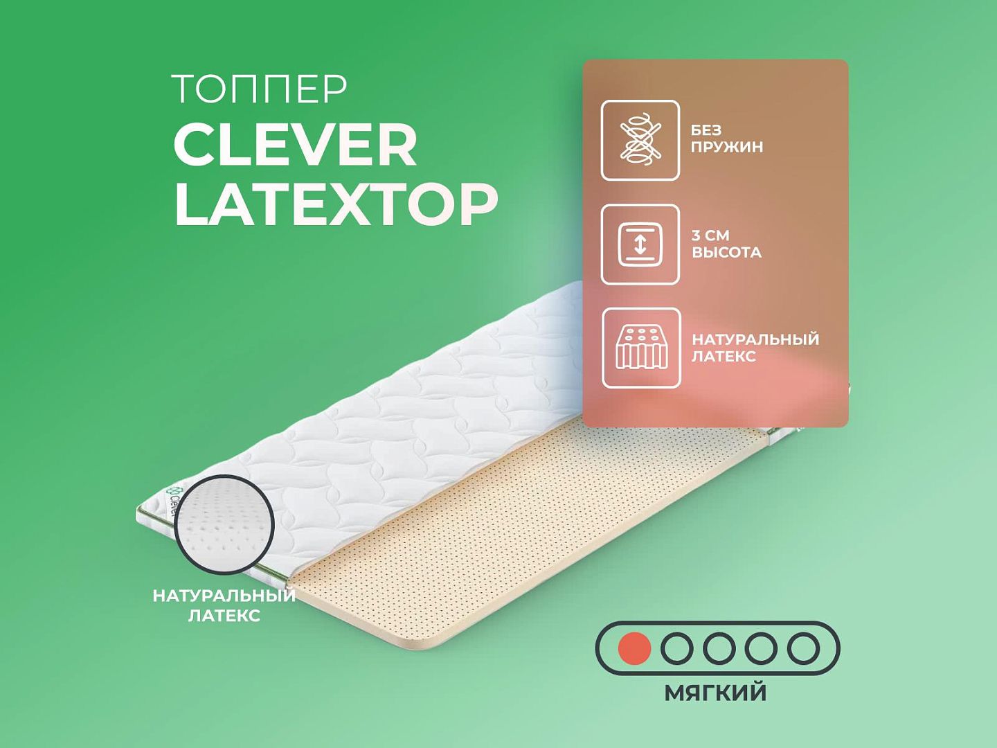 Фабрика Clever получила заслуженную репутацию, благодаря применению новых технологий и безупречному соблюдению стандартов качества. Топпер Clever LatexTop — образец продукта с лучшими характеристиками и доступной ценой, матрас создан из дышащих тканей, с эффектом вентиляции.